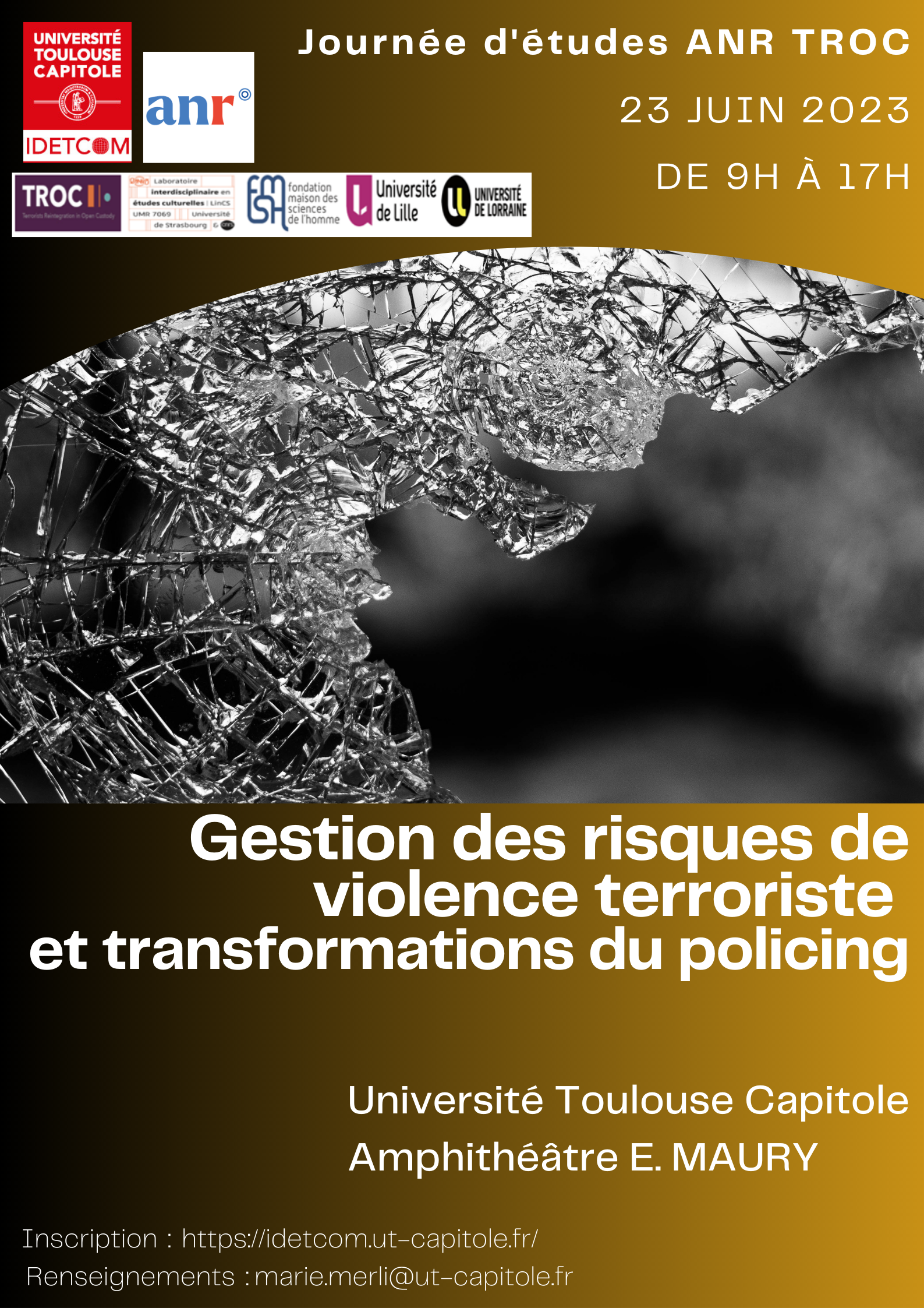 Cette journée d’étude vient éclairer quelques-unes de ces dynamiques de transformation de l’action publique en matière de police au regard de ces enjeux liés à la gestion des risques de terrorisme. Il est organisé dans le cadre du WP 2 - New decision-making logics in Terrorist Violence Risk Management and Policing Transformations - du projet TROC (Terrorist réintégration in Open Custody) financé par l’Agence Nationale de la Recherche (ANR).