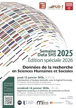 Dans le cadre de la Semaine Data SHS 2025, deux événements sont organisés à l’Université Toulouse Capitole les 15 et 16 janvier 2026.