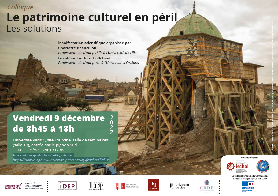 Le patrimoine culturel représente l'un des enjeux majeurs de la coopération internationale et nationale contemporaine. La mondialisation des échanges, et notamment du tourisme, le changement climatique ou encore les conflits armés sont autant de facteurs de mise en péril de ce patrimoine. Au-delà de cette apparente diversité, de nombreux enjeux communs unissent ces problématiques désormais globales : paix internationale et culture ; libre circulation, accès et conservation du patrimoine ; climat et droits de l'homme. Pourtant, les diverses branches du droit appelées à régir ces problématiques aiguës ne sont que rarement mises en dialogue. La présente initiative vise à créer les conditions d'un échange scientifique structuré unissant universitaires et praticiens, spécialistes de droit public et privé, de droit interne et de droit international, dans le champ du droit du patrimoine culturel, du droit humanitaire ou encore du droit de l'environnement.