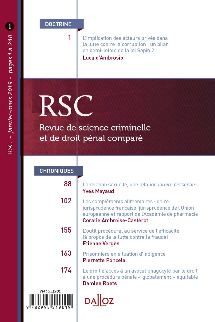 RSC "revue de science criminelle et de droit comparé". Janvier-mars 2019 pages 1 à 240.