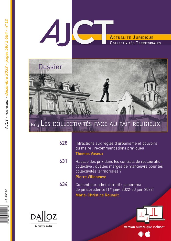 L'AJCT, dans son numéro 12/2022, a publié un dossier intitulé « Les collectivités face au fait religieux ». Article de Nathalie Bettio p. 604