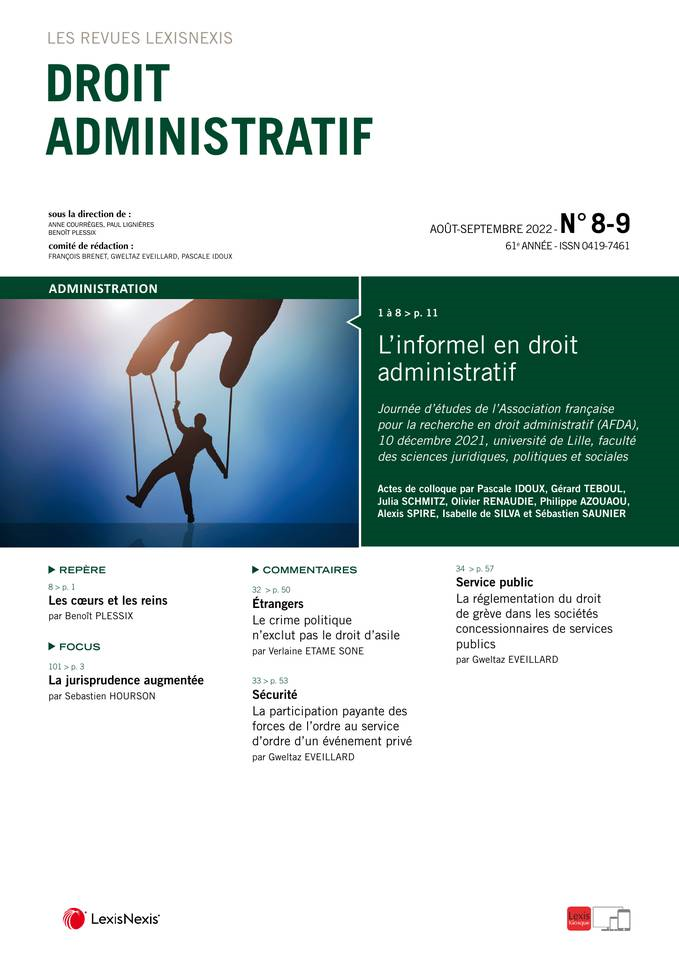 Droit Administratif n° 8-9, Août 2022. Actes de colloque "L'informel en droit administratif" de l'Association française pour la recherche en droit administratif (AFDA), 10 décembre 2021, université de Lille, faculté des sciences juridiques, politiques et sociales. Etude par Sébastien Saunier professeur de droit public, Université Toulouse Capitole, Idetcom (EA785)