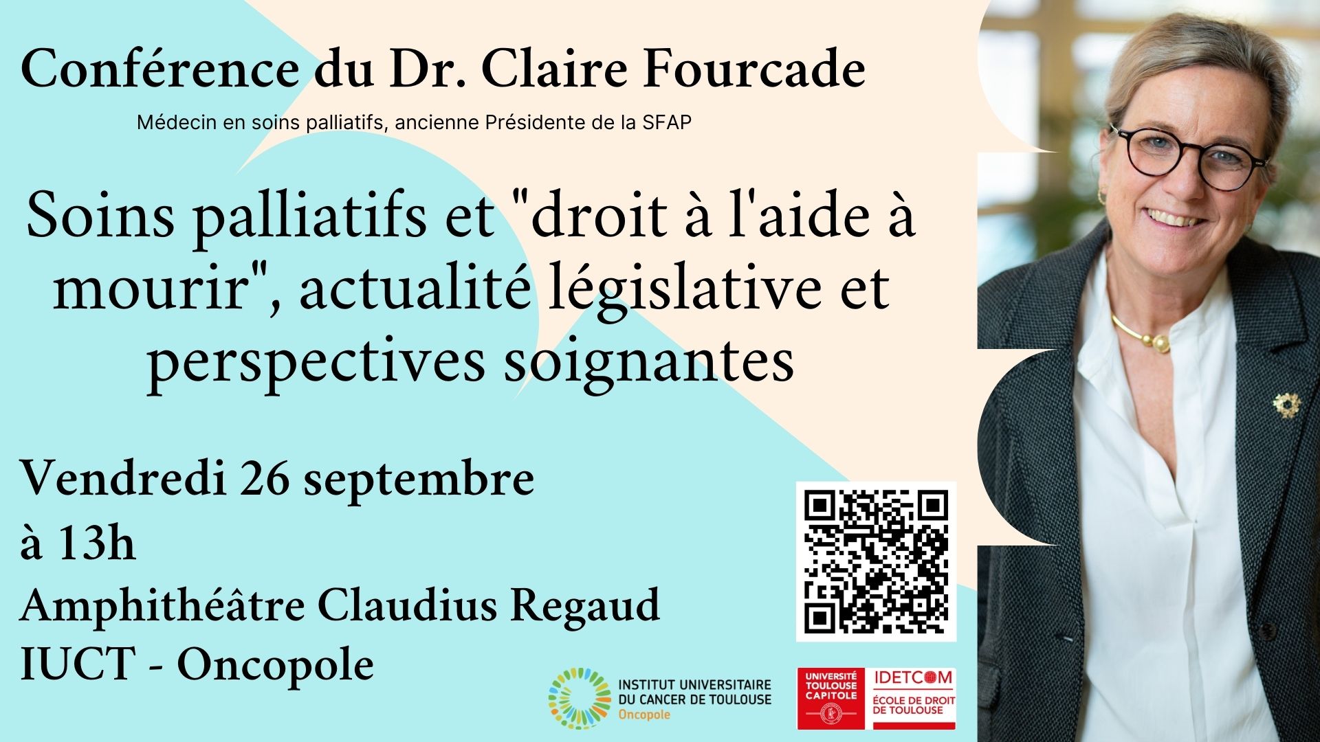 Le 26 septembre 2025, une conférence organisée conjointement par Lucie Sourzat, Maître de conférences à l’École de droit de l’Université Toulouse Capitole et membre de l’IDETCOM (Institut du Droit de l’Espace, des Territoires, de la Culture et de la Communication), et Bettina Couderc, responsable du Comité de Réflexion Éthique de l’IUCT Oncopole, a réuni experts, professionnels de santé et citoyens autour d’un sujet de société majeur : les enjeux des deux propositions de loi relatives aux soins palliatifs et l’aide active à mourir.